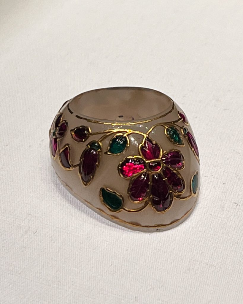 Archery was a popular sport during the Mughal era, and as with everything they did, ornate ceremonial versions of equipment were created. These thumb rings were designed to protect the archer’s hand from the bowstring as it snapped back after a shot. However, these particular rings would have been worn decoratively during a Durbar, rather than for actual use in the sport.