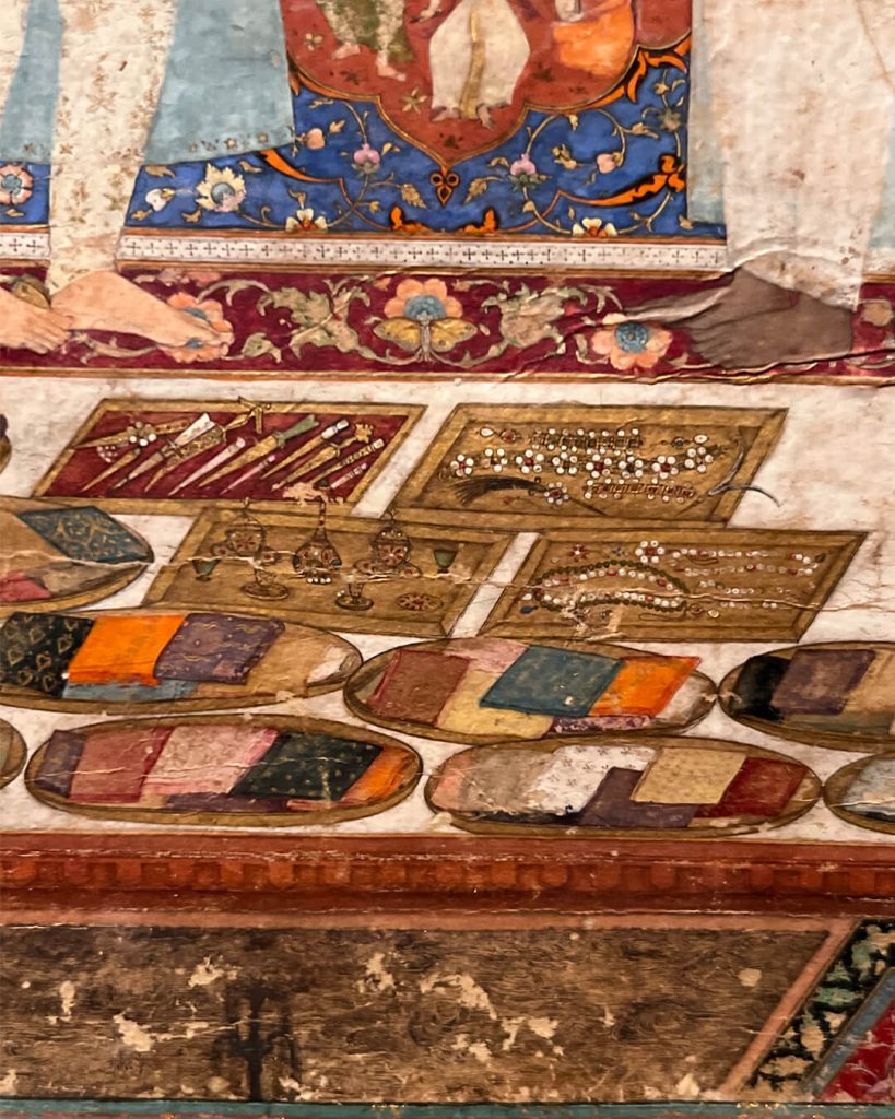 In the foreground, you can see bejewelled daggers, pearl necklaces, and golden vessels used as weighing objects, highlighting the lavishness of the ceremony. This remarkable piece of Mughal art appears in the Jahangir Nama (‘Book of Jahangir’).