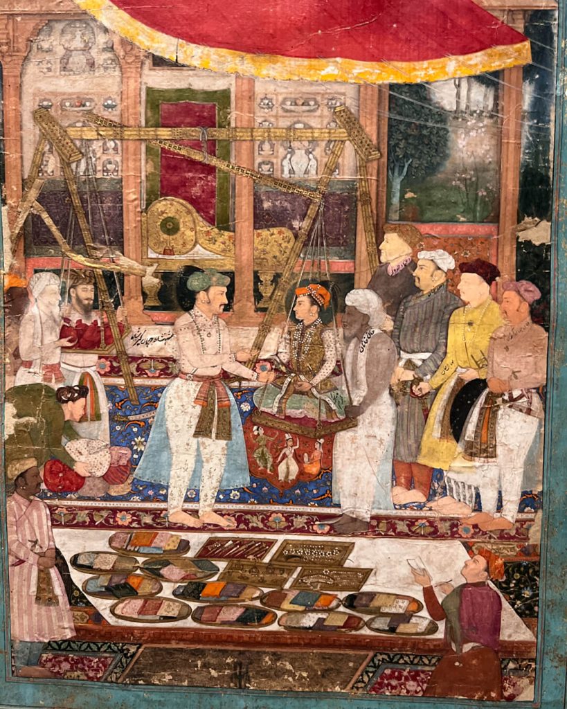 This famous painting, which I referenced in my dissertation, ‘Objects of Imperial Power and Status During the Mughal Empire’, back in 2014, depicts the grand spectacle of Prince Khurram – later known as Shah Jahan – being weighed against a variety of precious objects on his birthday in 1614.