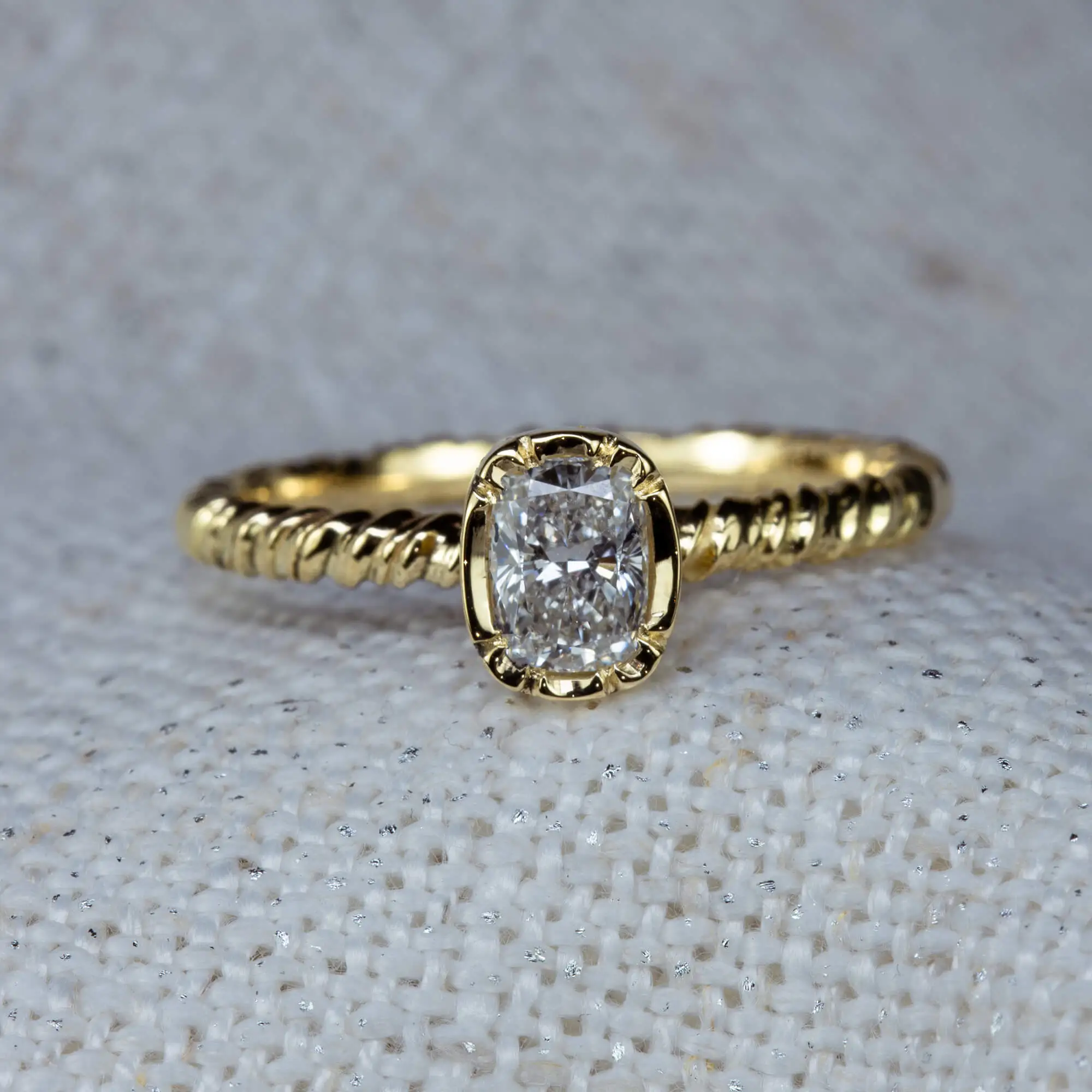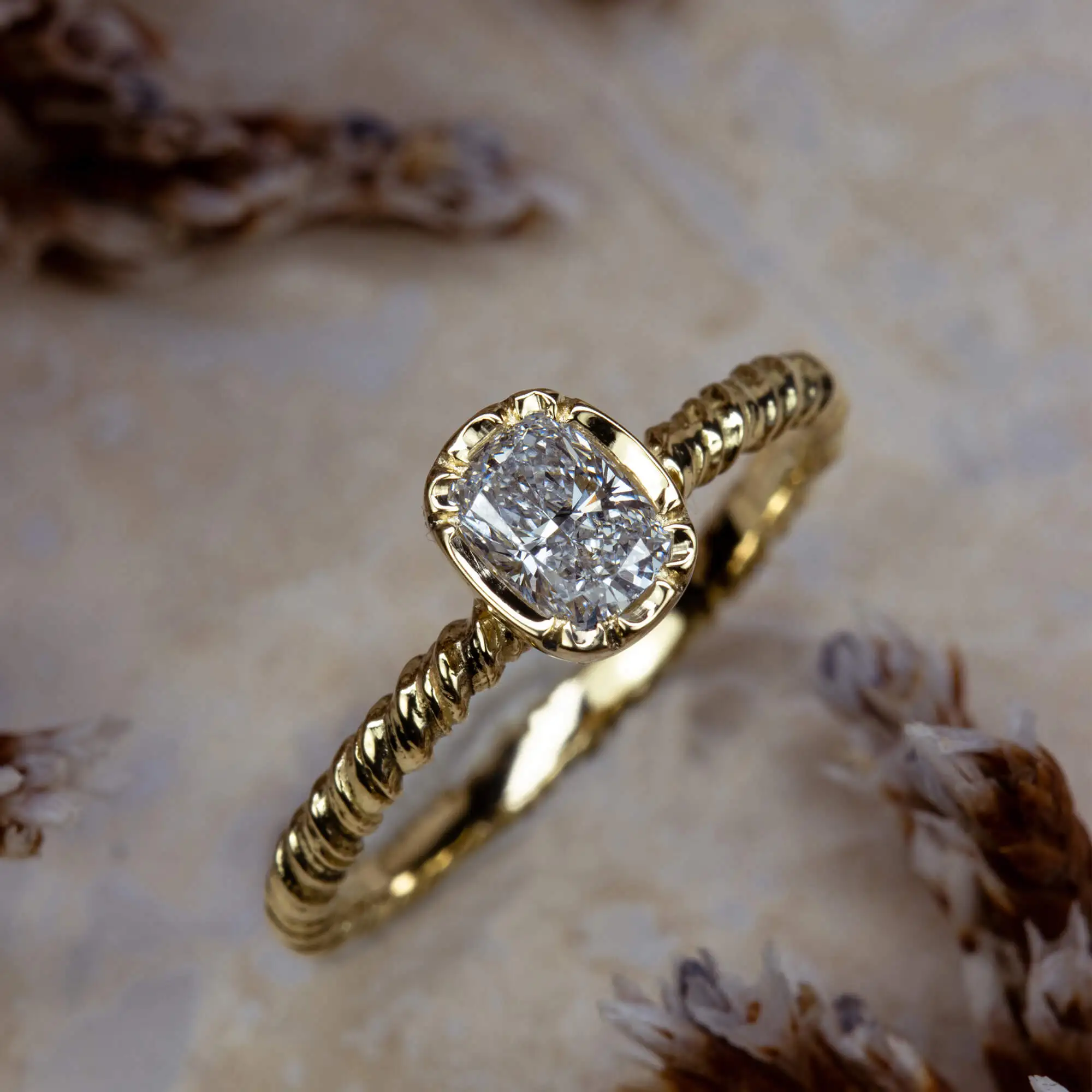 This exquisite cushion-cut diamond solitaire engagement ring showcases a beautiful, one-of-a-kind laboratory-grown diamond of .40cts, D colour and VS1 clarity. Set in Natalie’s signature floral-inspired setting with delicate scalloped details, it also features a hidden, frosted flower beneath the diamond – an intimate, symbolic touch to treasure.